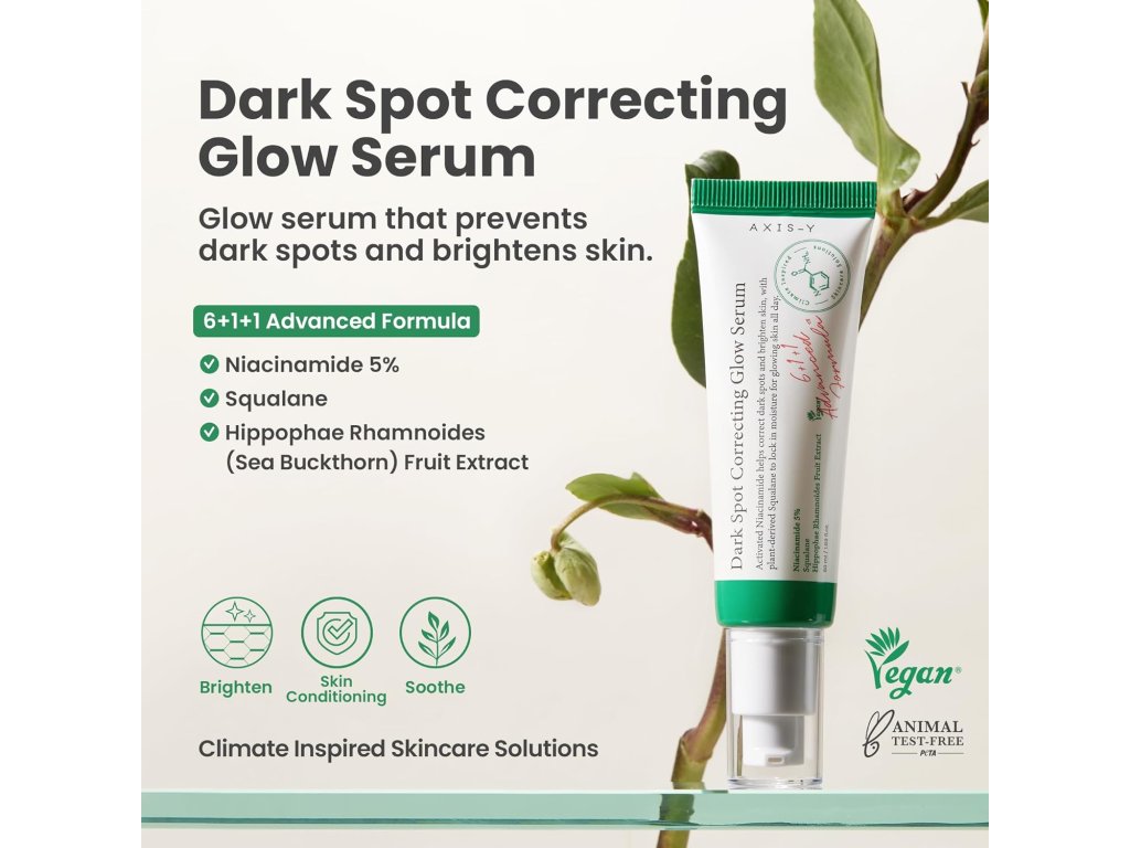 AXIS-Y Dark Spot Correcting Glow Serum 50 ml je rozjasňující sérum s 5 % niacinamidem pro korekci tmavých skvrn, sjednocení tónu pleti a hydrataci – lehká textura, vegan a cruelty-free.