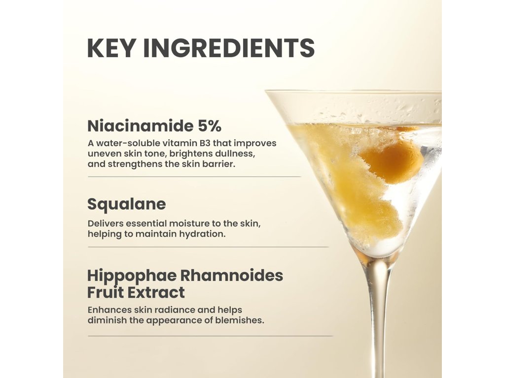 Water, Glycerin, Niacinamide, Sodium Hyaluronate, Propanediol, Erythritol, Butylene Glycol, Squalane, Oryza Sativa (Rice) Bran Extract, Calendula Officinalis Flower Extract, Carica Papaya (Papaya) Fruit Extract, Hippophae Rhamnoides Fruit Extract, Malpighia Glabra (Acerola) Fruit Extract, Polyglyceryl-10 Laurate, Chlorphenesin, Arginine, Ethylhexylglycerin, Carbomer, Glutathione, 1,2-Hexanediol, Hydroxypropyl Cyclodextrin, Disodium EDTA, Hydroxyethylcellulose, Allantoin, Rosmarinus Officinalis (Rosemary) Leaf Oil. :contentReference[oaicite:15]{index=15}