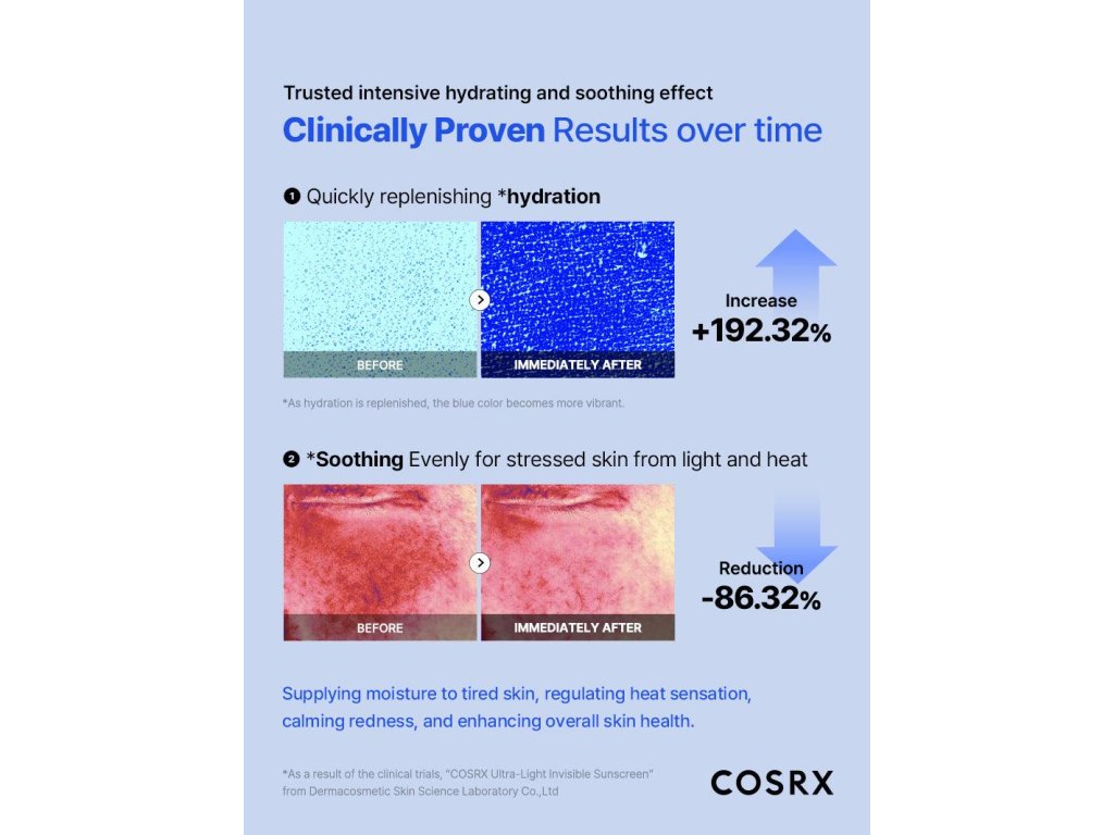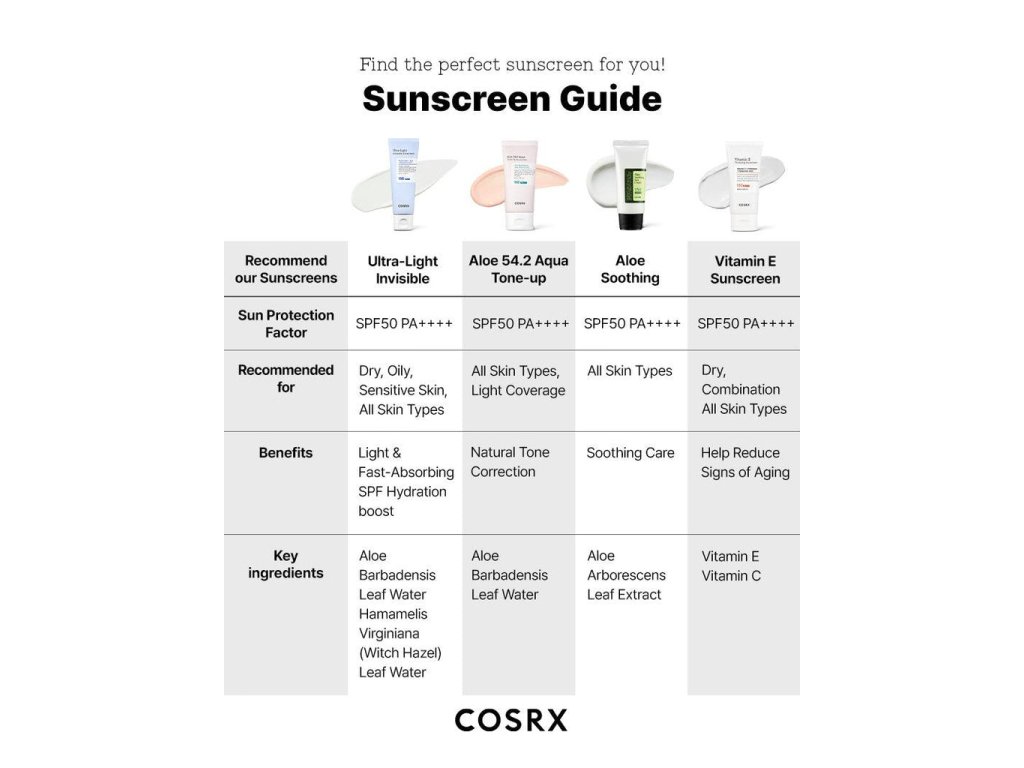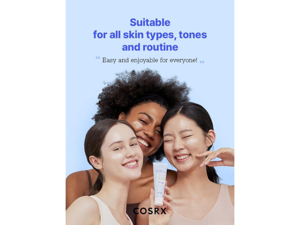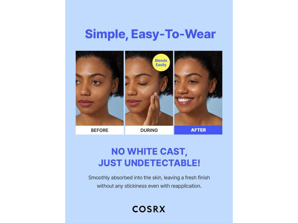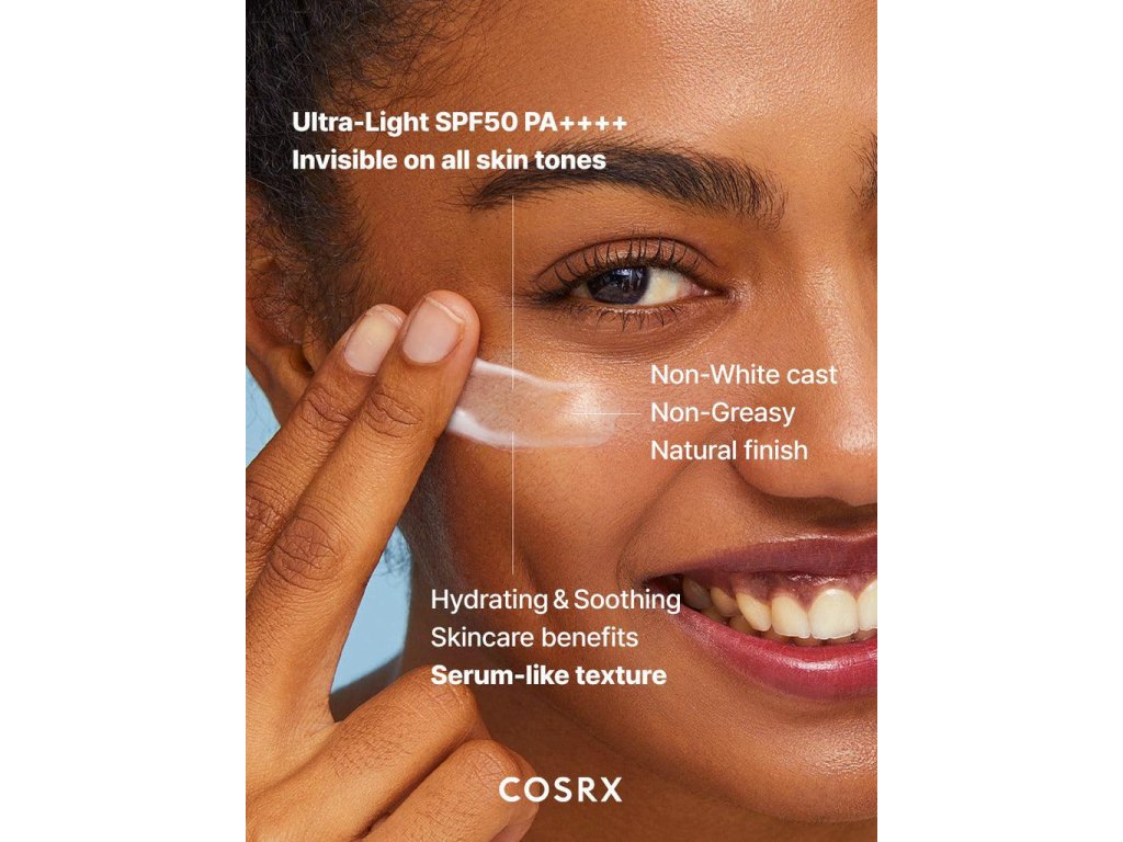 Toto průhledné a lehké složení poskytuje ochranu SPF bez typického bílého nádechu, takže je ideální pro všechny odstíny pleti. Opalovací krém se rychle vstřebává a poskytuje nemastný, osvěžující povrch, který hydratuje pokožku po celý den. Je ideální pro každodenní použití a venkovní aktivity, chrání pokožku před škodlivým UV zářením a zároveň je prakticky beztížný. Tento opalovací krém je speciálně vyvinutý pro osoby s citlivou pokožkou a poskytuje jí hydrataci, aniž by ucpával póry nebo způsoboval podráždění. Ať už se chystáte na pláž nebo si jen užíváte slunečného dne, neviditelný opalovací krém COSRX Ultra Light zajistí, že vaše pokožka zůstane chráněná, hydratovaná a v pohodlí. Dopřejte si bezstarostný pobyt na slunci s tímto neviditelným, k pokožce šetrným štítem, který’je ideální pro každý typ pleti.