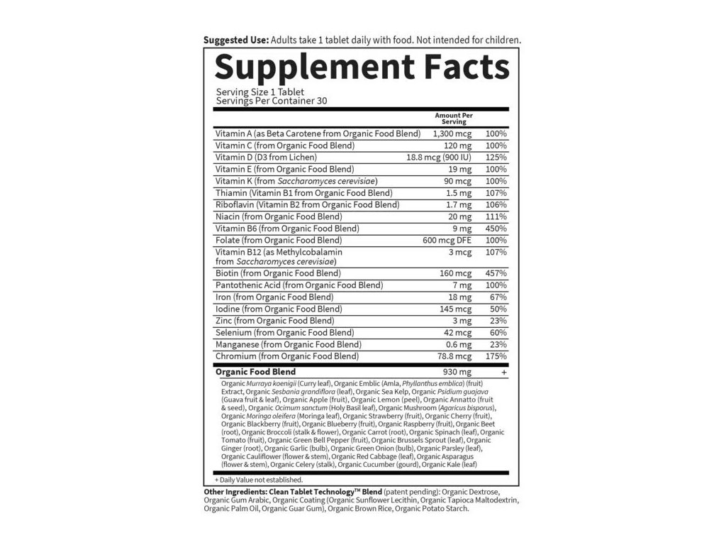 Whole Food Multi, která je certifikovaná jako organická, ověřená Non-GMO, ze skutečných, výživných potravin.