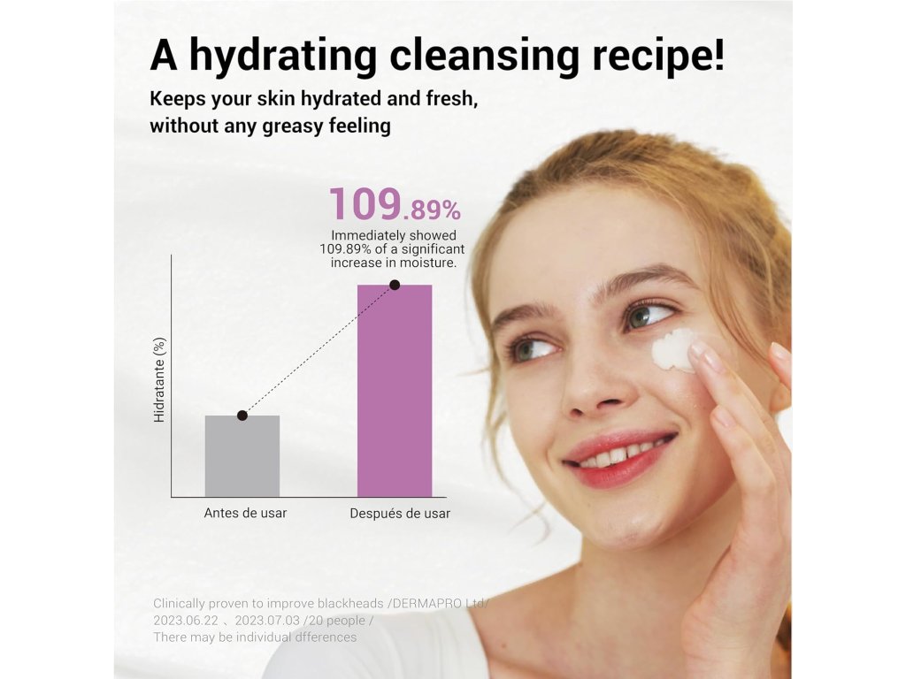 - Okamžité zvýšení hydratace přibližně o 108,89 % – pleť je po mytí jemná a bez pnutí.