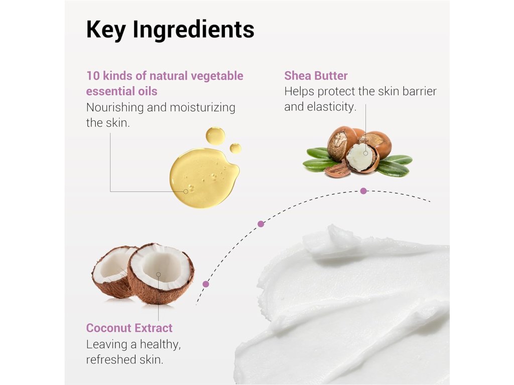 Ethylhexyl Palmitate, Cetyl Ethylhexanoate, PEG-20 Glyceryl Triisostearate, Polyethylene, PEG-8 Isostearate, Butyrospermum Parkii (Shea) Butter, Cocos Nucifera (Coconut) Fruit Extract, Citrus Aurantifolia (Lime) Fruit Extract, Freesia Refracta Extract, Iris Versicolor Extract, Jasminum Officinale (Jasmine) Extract, Lilium Tigrinum Extract, Leontopodium Alpinum Extract, Nelumbium Speciosum Flower Extract, Narcissus Pseudo-Narcissus (Daffodil) Flower Extract, Rose Extract, Citrus Aurantium Dulcis (Orange) Peel Oil, Lavandula Angustifolia (Lavender) Oil, Pelargonium Graveolens Flower Oil, Amyris Balsamifera Bark Oil, Citrus Paradisi (Grapefruit) Peel Oil, Eucalyptus Globulus Leaf Oil, Melaleuca Alternifolia (Tea Tree) Leaf Oil, Juniperus Mexicana Oil, Boswellia Carterii Oil, Citrus Aurantium Bergamia (Bergamot) Fruit Oil, Tocopheryl Acetate, 1, 2-Hexanediol.