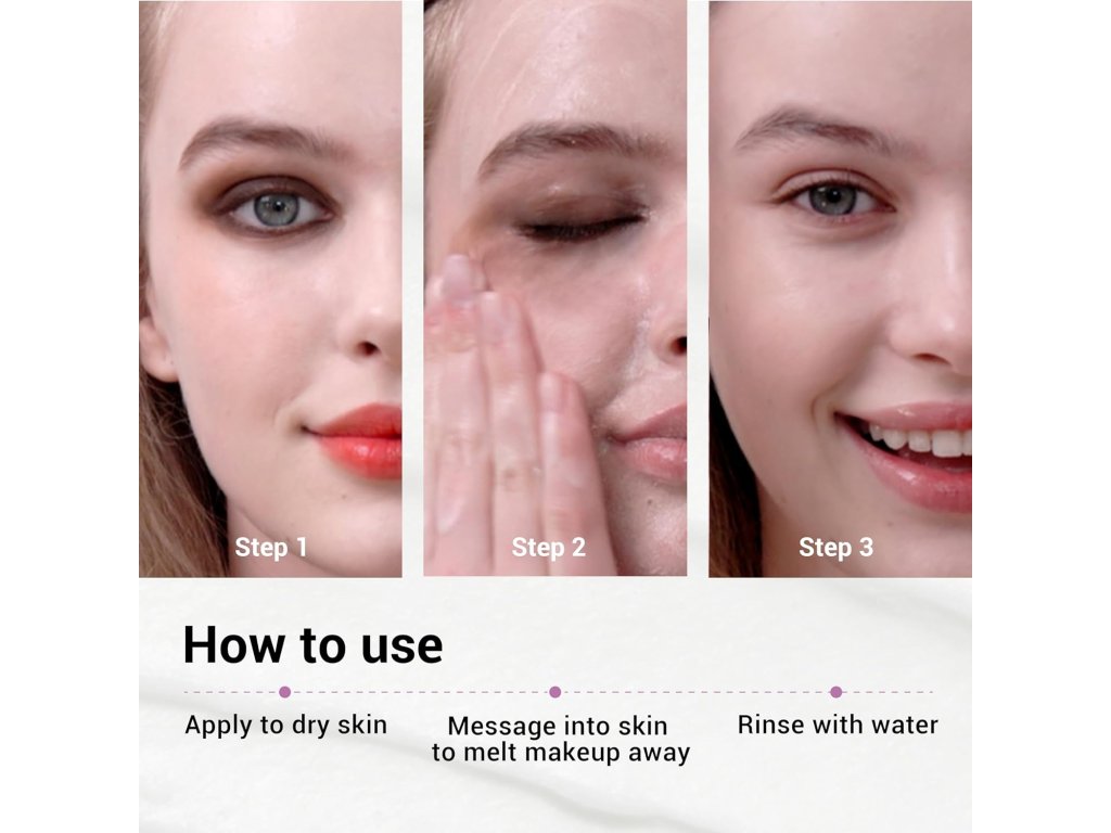 - S suchými dlaněmi naberte malé množství balzámu a krouživě masírujte suchý obličej (zaměřte se na T-zónu a oční líčení).