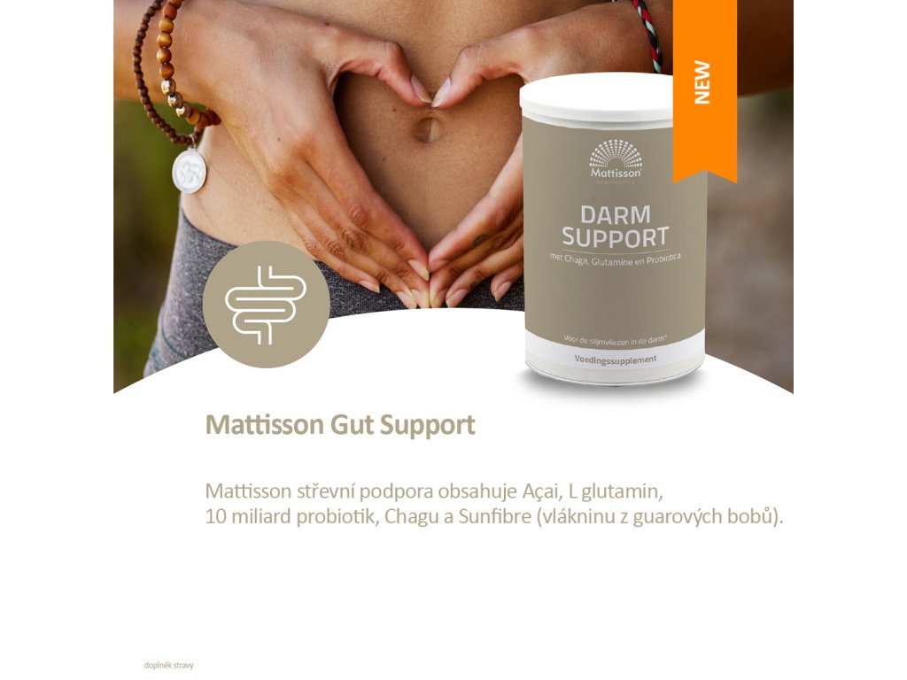 Mattisson střevní podpora obsahuje Açai, L glutamin, 10 miliard probiotik, Chagu a Sunfibre (vlákninu z guarových bobů).