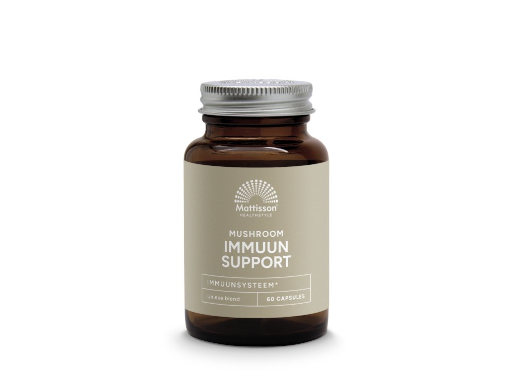 Mattisson Mushroom Immune Support obsahuje houby lví hřívu, shiitake, maiitake, reishi, cordyceps a čagu v kombinaci s methioninem zinku.