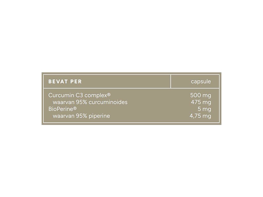 Curcumin C3 Complex® (extrakt Curcuma longa), HPMC vegetariánská kapsle (obal), MCC (protispékavá látka), BioPerine® (extrakt z černého pepře – Piper nigrum), magnesium stearate (protispékavá látka).