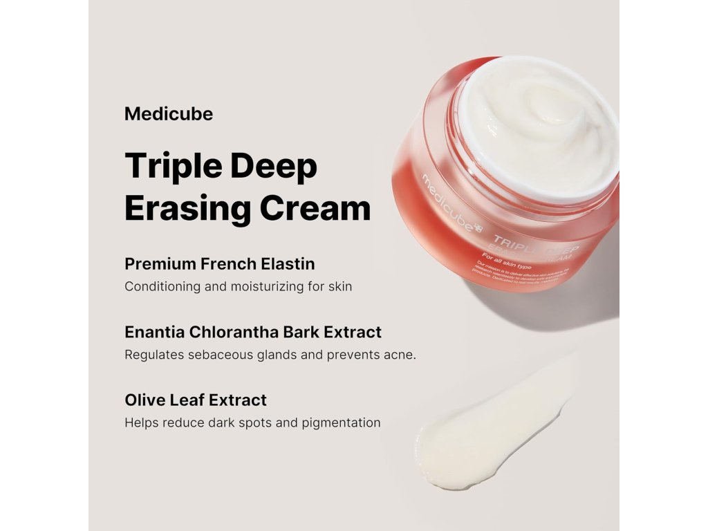 Triple Deep Erasing Cream Voda, glycerín, dipropylénglykol, cetearylalkohol, cyklopentasiloxán, kaprylový/kaprinový triglycerid, trietylhexanoín, hydrogenovaný polydecén, 1,2-hexándiol, niacínamid, hydrogenovaný poly(C6-14 olefín, cyklohexosasiloxanový extrakt), ceklohexosasiloxanový extrakt Glukozid, glycerylstearát Se, extrakt z Aesculus Hippocastanum (pagaštan konský), extrakt z kvasu Pseudoalteromonas, extrakt z listov/koreňov/stoniek Piper Methysticum, extrakt z Centella Asiatica, extrakt z plodov ženšenu panaxového, extrakt z kvetu Oenothera Primrose (večerný kvet), Výťažok z koreňa Ulmus Davidiana, Výťažok z listov Pinus Palustris, Výťažok z koreňa Pueraria Lobata, Výťažok z kôry Enantia Chlorantha, Výťažok zo semien Lupinus Albus, Výťažok z listov Olea Europaea (Olivy), Výťažok z listov Cryptonica, Výťažok z listov Nelumbo Nucifera Hydroomgenumgenemeria, Cinna lecitín, olej z jadier Argania Spinosa, hyaluronát sodný, olej zo semien Helianthus Annuus (slnečnicový), dimetikón, skvalán, C12-16 alkoholy, glycerylstearát, cetearyl olilát, sorbitan olivát, Hydroxyetylakrylát/akryloyldimetyltaurát sodný kopolymér, fruktóza, mikrokryštalická celulóza, butylénglykol, kyselina palmitová, metylpropándiol, hydrogenovaný polyizobutén, polyquaternium-51, betaín, alkohol, glykozyltrehalóza, celulóza-1glycerol, celulóza-1-glycerát gulát-Ison Hydrolyzovaný kukuričný škrob, Hydrogenovaný škrobový hydrolyzát, Beta-glukán, Rafinóza, Biosacharid Gum-1, Kyselina stearová, Butyrospermum Parkii (bambucké) maslo, Adenozín, Polyglyceryl-2 Dipolyhydroxystearát, Edta disodná, Lecitín, Sacharóza, Bisabolol, Panthenol, laurylkarbamát inulínu, kyselina listová, stearoylglutamát disodný, kyselina citrónová, ceramid Np, cholesterol, askorbyl glukozid, zinok Pca, trometamín, palmitoyl tripeptid-5, fermentovaný filtrát sacharomyces, kapryloyl glycin, hexylén-glycerol, hexylén-glycerol, hexylén-glycerol tokoferol, sarkozín, maltodextrín, sacharidový hydrolyzát, Palmitoyl pentapeptid-4, kyselina oleanolová, hydrolyzovaný elastín, desamidokolagén, Peg-100 stearát, polysorbát 60, vôňa, etylhexylglycerín, sorbát draselný, kaprylylglykol, linalool, benzylsalicylát, limonén, hydroxycitronellal.