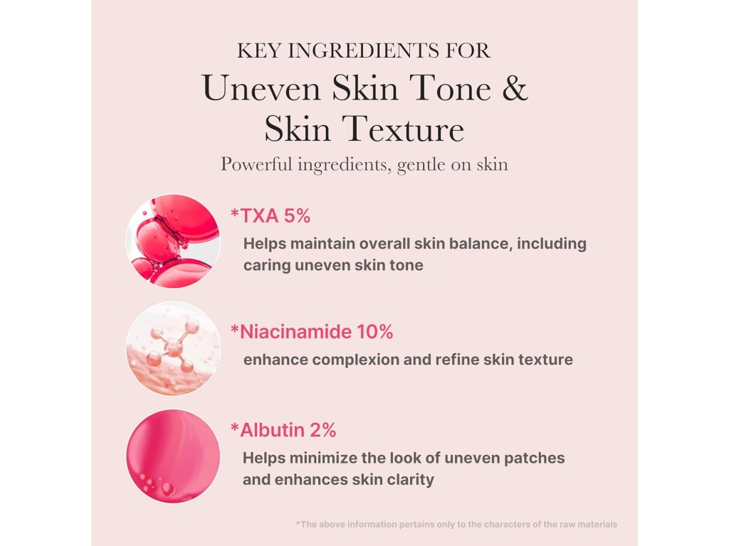 Water, Niacinamide, Glycerin, Butylene Glycol, Tranexamic Acid, Arbutin, Diethoxyethyl Succinate, Chlorphenesin, C12-14 Alketh-12, Ethylhexylglycerin, Xanthan Gum, Carbomer, Adenosine, Disodium EDTA, Melia Azadirachta Leaf Extract, Melia Azadirachta Flower Extract, 1,2-Hexanediol, Panthenol, Cyanocobalamin, Betaine, Coccinia Indica Fruit Extract, Rosa Centifolia Flower Oil, Ferulic Acid, Corallina Officinalis Extract, Pentylene Glycol, Glutathione, Hydrolyzed Hyaluronic Acid, Hydrolyzed Sodium Hyaluronate, Dimethylsilanol Hyaluronate, Hyaluronic Acid, Potassium Hyaluronate, Sodium Hyaluronate, Hydroxypropyltrimonium Hyaluronate, Sodium Hyaluronate Crosspolymer, Sodium Hyaluronate Dimethylsilanol, Sodium Acetylated Hyaluronate, Acetyl Tetrapeptide-5, Hexapeptide-9, Palmitoyl Tripeptide-5.