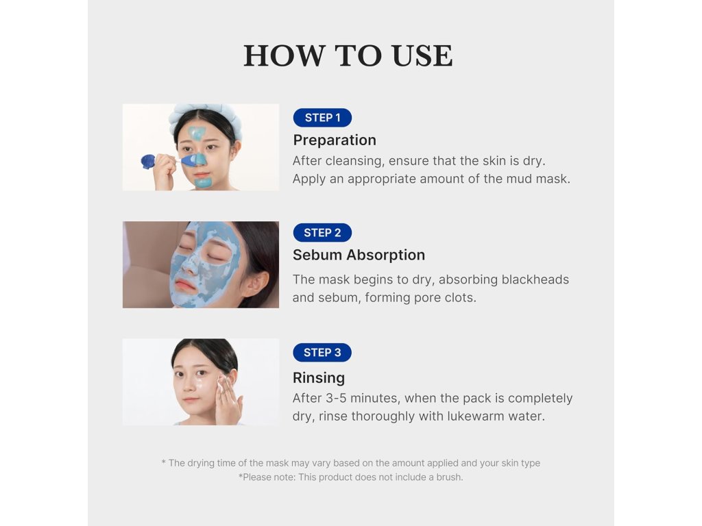 Naneste přiměřené množství na pleť, vyhněte se oblasti očí a úst, a nechte působit 3–5 minut, dokud maska nezaschne.