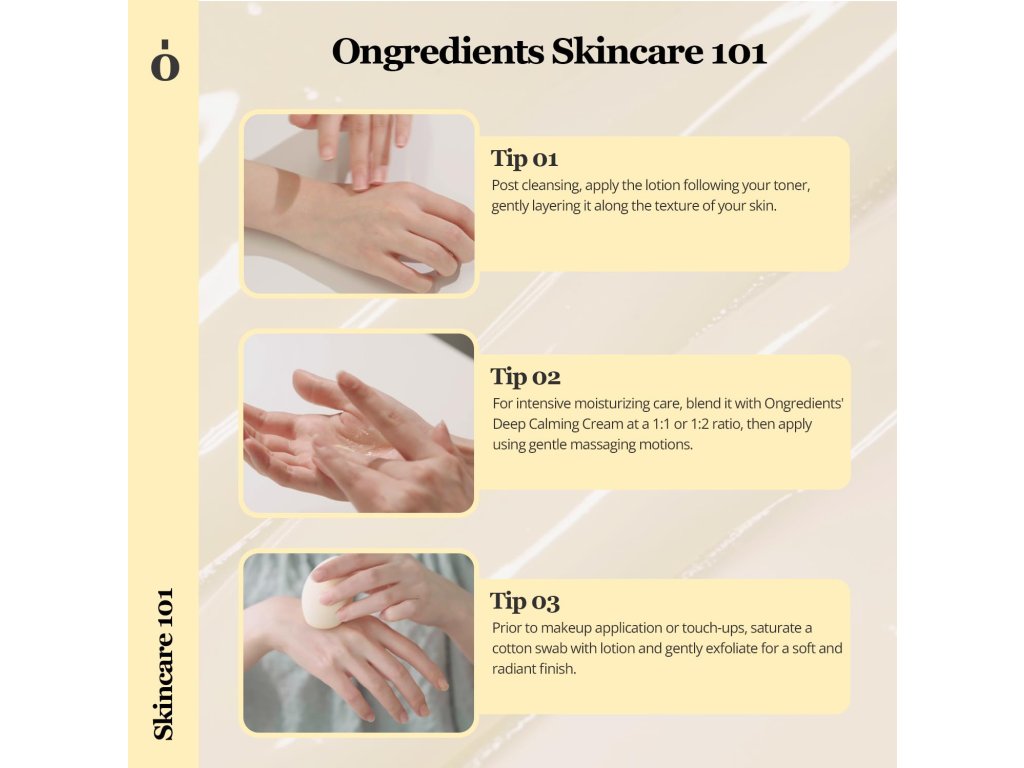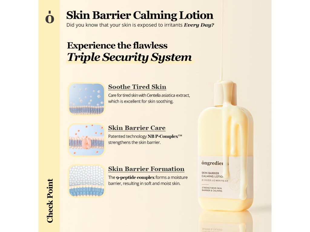 Ongredients Skin Barrier Calming Lotion je zklidňující pleťové mléko s lehkou „silk cream“ texturou, která je mezi esencí a krémem. Pomáhá zklidnit unavenou a citlivou pleť, posílit kožní bariéru a vytvořit hydratační ochranný film pro jemnější, pružnější a zdravěji vypadající pleť.