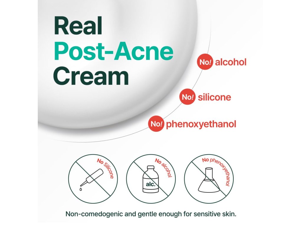 Krém je formulovaný tak, aby byl vhodný i pro pleť se sklonem k akné. Receptura je koncipována bez složek, které mohou některým typům pleti vadit (např. bez alkoholu, silikonů nebo phenoxyethanolu), a je zaměřená na podporu obnovy pleti po nedokonalostech.