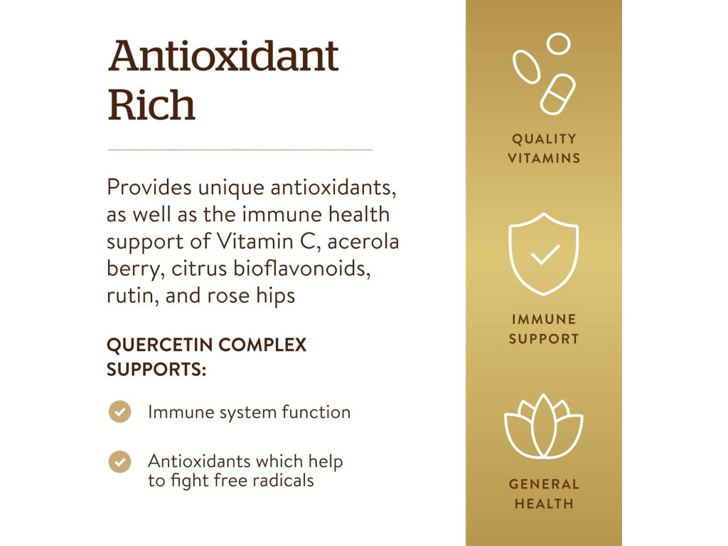 Solgar® Quercetin Complex obsahuje důležitý bioflavonoid kvercetin v synergické kombinaci s Ester-C® Plus, která poskytuje unikátní antioxidanty a podporu imunitního systému.