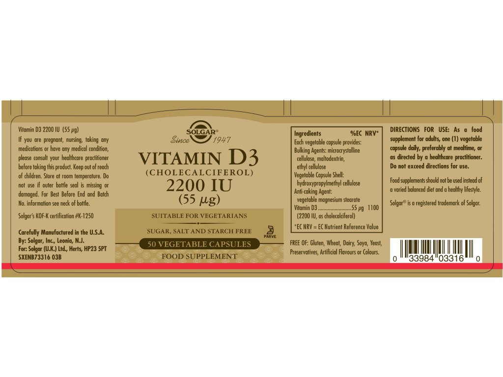 Tento prémiový produkt je jednou z řady přípravků Solgar D3, dostupných v různých dávkách a formách. Rostlinné tobolky vitaminu D3 (cholekalciferol) 2 200 IU (55 mikrogramů) v dávce 1 denně přispívají k: