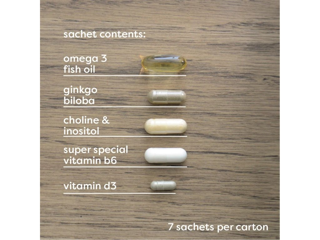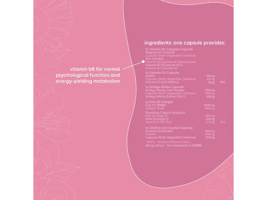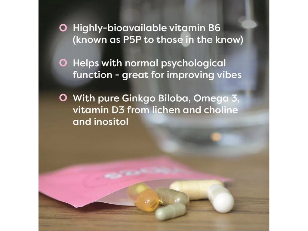 Hormony občas pořádně roztočí kolotoč emocí – od smíchu po slzy během pár minut. Pokud se během svých dnů necítíš úplně ve své kůži, Vibes ti může pomoci vrátit se do rovnováhy. Obsahuje vitamin B6, který přispívá k normální psychické činnosti a hormonální rovnováze, omega-3, vitamin D3, ginkgo bilobu a kombinaci cholinu a inositolu – tedy živiny, které pečují o tvůj mozek, nervový systém i celkovou pohodu.