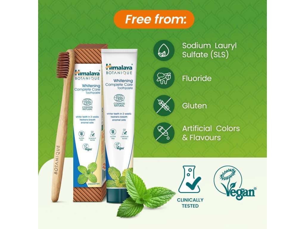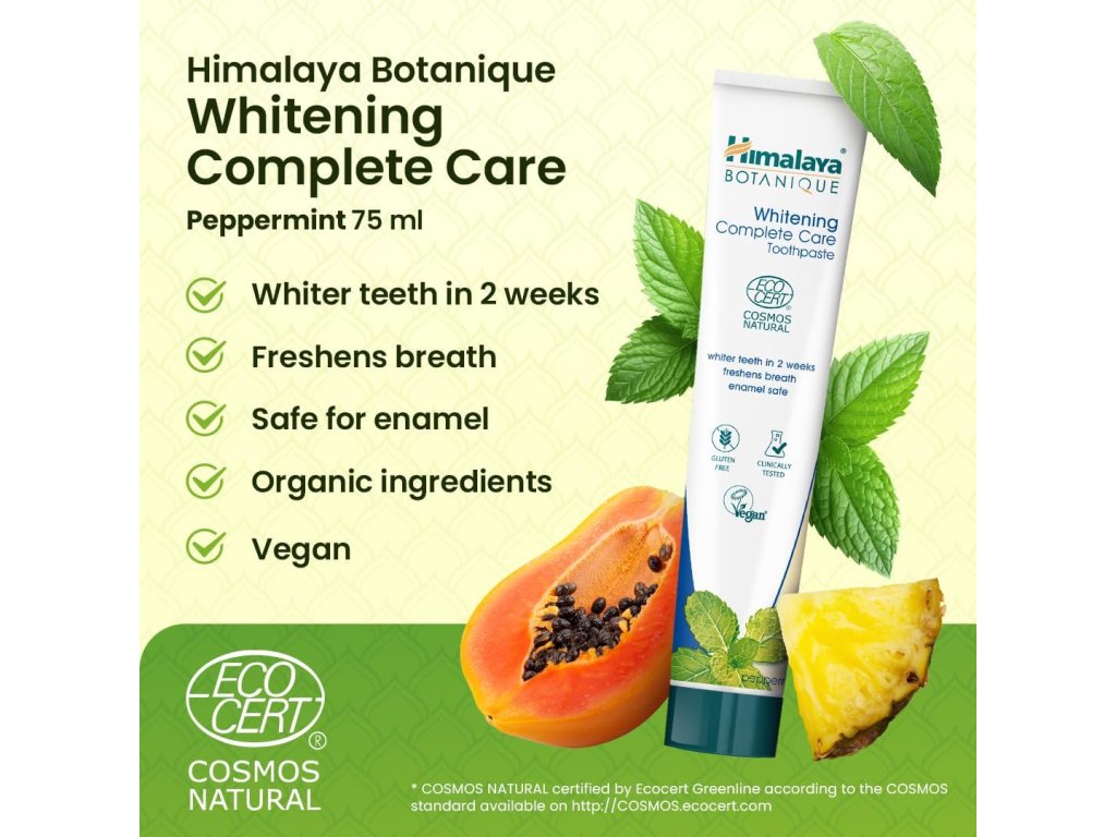 Veganská, rostlinná zubní pasta Himalaya Botanique Whitening Complete Care Peppermint obsahuje pečlivě vybrané aktivní látky organického původu a je určena pro všechny, kteří chtějí mít přirozeně zdravý a zářivě bílý úsměv.