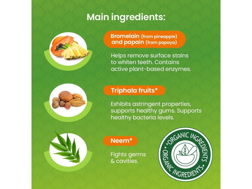 Xylitol z březového dřeva pomáhá bojovat proti bakteriím, které se tvoří v zubním plaku. Certifikovaný extrakt z granátového jablka zklidňuje drobná podráždění, zatímco směs organických plodů Triphala má protizánětlivé účinky a podporuje zdravé, pevné dásně. Extrakt z listů nimby důkladně čistí a brání tvorbě zubního plaku. Máta peprná dodává svěží dech a dlouhotrvající pocit čistoty.